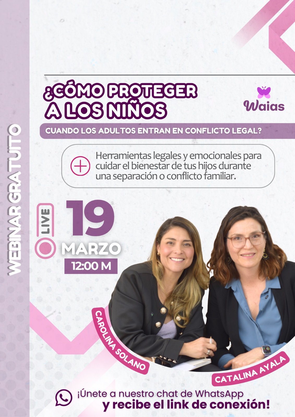 👩⚖️ Tu guía legal será Carolina Solano, abogada y fundadora de WAIAS, quien compartirá su experiencia acompañando a familias en la toma de decisiones legales durante procesos de separación o conflicto familiar, siempre priorizando el bienestar de los niños.